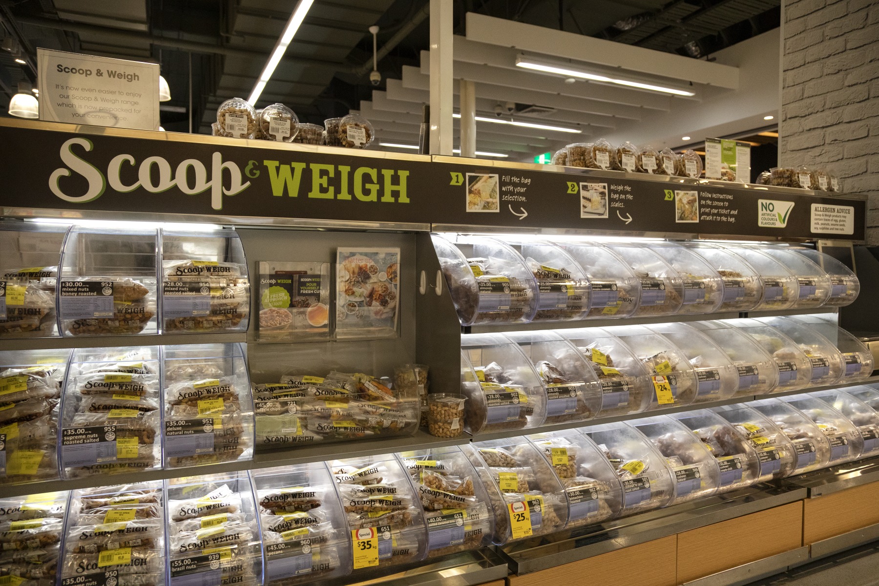 Photographer's note: In Coles supermarket, Raine Square, the normally 'self-service' nut and dried fruit counter displays pre-packaged and weighed plastic ziplock packages. Done so as to avoid cross-contamination if customers were to do it themselves. COVID-19 disease is caused by a COVID or coronavirus.