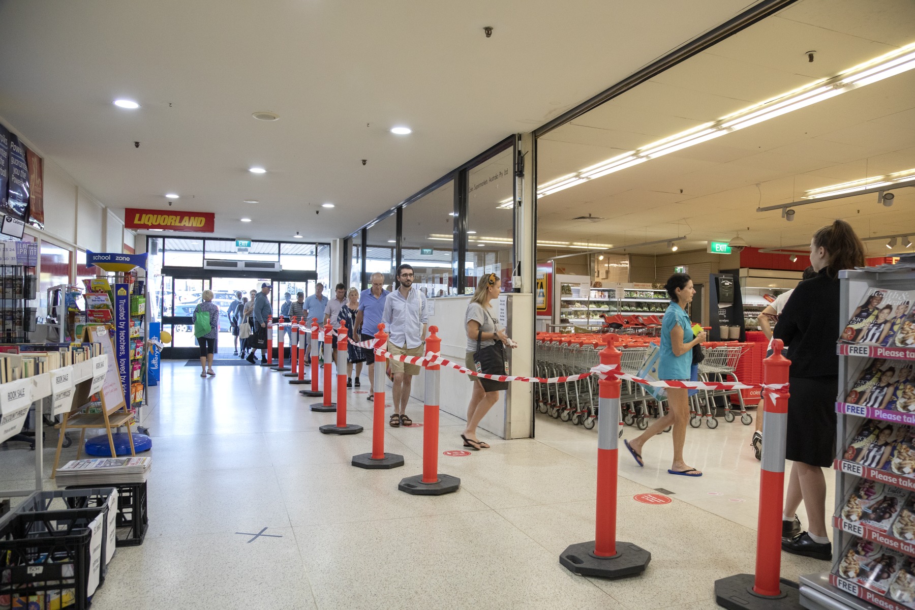 Photographer's note: In anticipation of busier than normal shopping days in the lead up to the Easter long weekend, Coles North Perth set up control lines for social-distancing queuing, that extended outside the arcade into the car park. With restrictions placed on travel with in the State, Perth residents were forced to stay home during Easter, thus supermarkets expected further rush buying of key items. COVID-19 disease is caused by a COVID or coronavirus.
