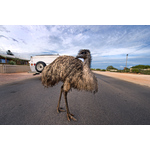 BA2840/1673: An emu greets the photographer at the CoVID-19 regional checkpoint about 10 meters from the entrance of the Shark Bay Caravan Park in Denham, 19 April 2020