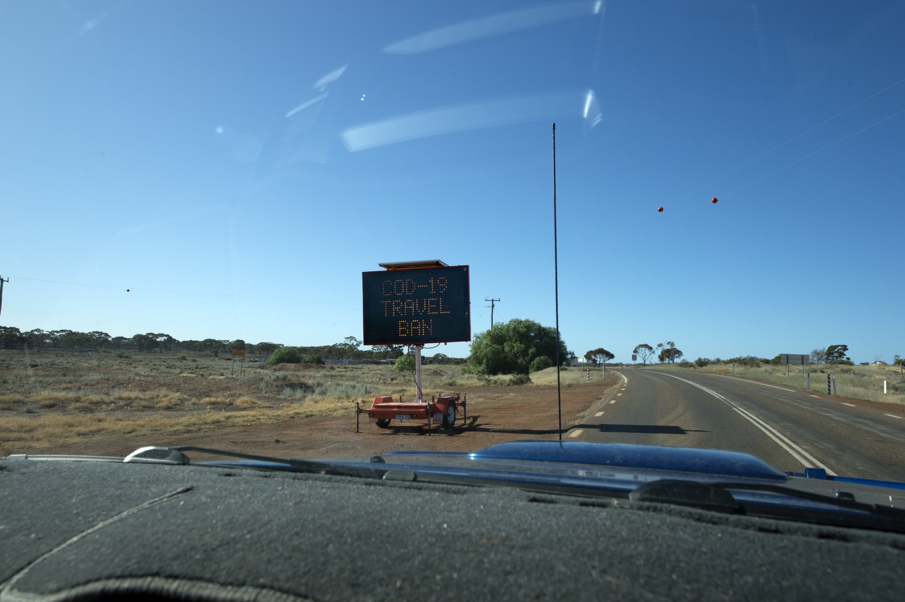 The photographer, Darren Clark, documents his journey through COVID-19 Western Australian regional border restrictions from Karratha to the border at Eucla. He is stopped by police outside Karratha, outside Denham, on the Brand Highway before the Great Northern Highway, Mundaring, outside Coolgardie and Eucla. Signs warning of checkpoints and travel restrictions and advising of new hygiene and social-distancing rules appear along the route. In Tammin and Merredin he is refused service and locals refuse to let him stop so he is forced to travel on to Southern Cross. Social-distancing is enforced at the almost deserted Cocklebiddy Roadhouse and he stays at the Cocklebiddy Motel before crossing the border at Eucla. On 1 April 2020 the Western Australian State Government introduced intrastate travel restriction, limiting movements between the regions of W.A. Travel between regions was restricted, with police checkpoints set up at the borders. Only essential travel was permitted. At some checkpoints, police were assisted by Australian Army and W.A. emergency services personal. Remote communities and some "biosecurity areas" had further travel restrictions due to the lack of medical facilities and number of high risk community members. These travel restrictions were substantially lifted Friday 29 May with the exception of the Kimberley and some vulnerable Aboriginal communities in the Pilbara.