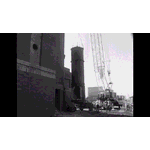 Work being carried out at East Perth Gasworks. Mobile crane on ground with large chimneys; building with workmen in window; crane working on building; chimney being lifted out from building; men on ground watching; gasworks shot from a distance. The East Perth Gasworks were decommissioned in 1971 and were dismantled over a number of years.