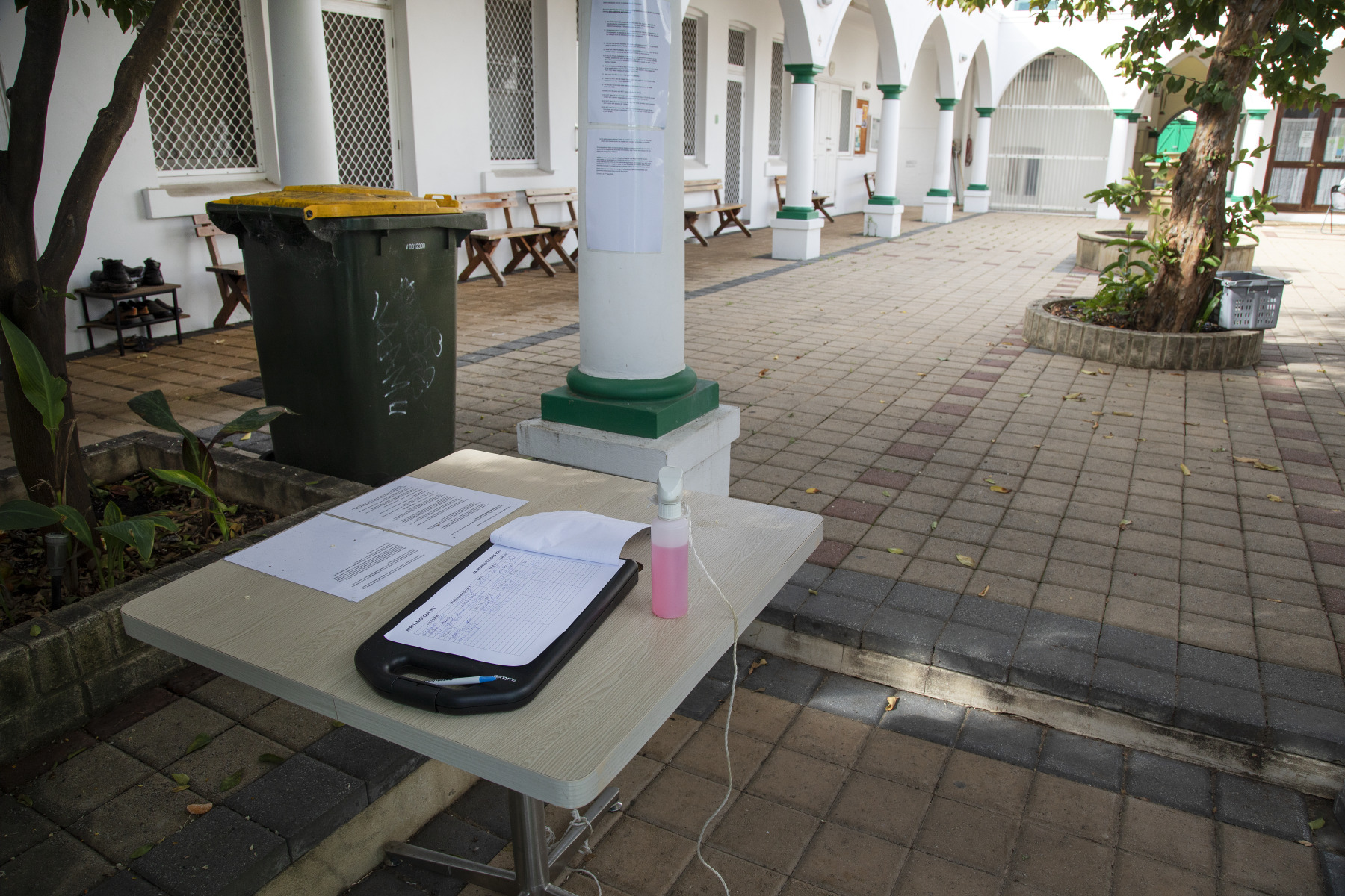 BA2493/2961: During the COVID-19 lockdown a registration booklet for all attendees (and sanitiser) was set up inside the rear entry off Brisbane Place at Perth Mosque