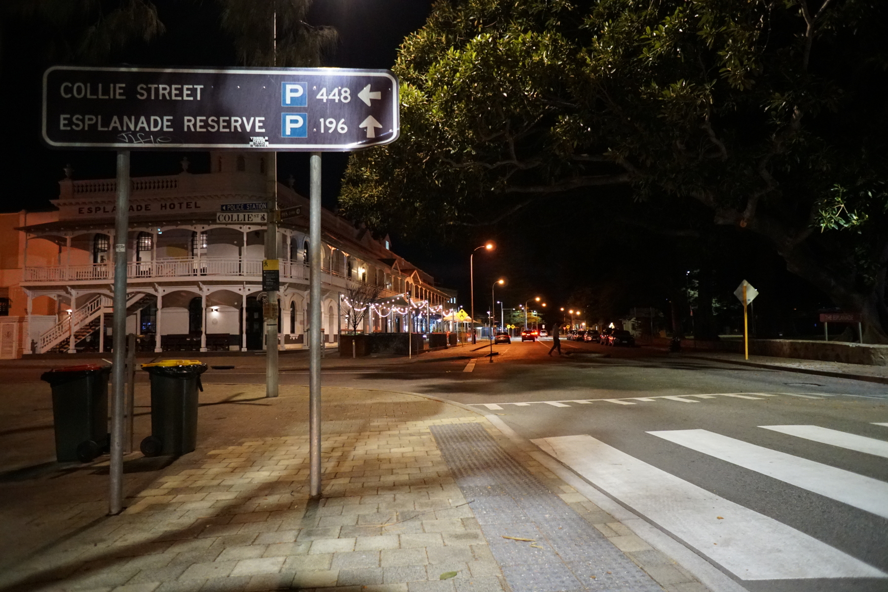 A view of unnaturally empty streets of Fremantle during the COVID-19 lockdown. In normal times these streets and the Esplanade Hotel would be buzzing with night life.