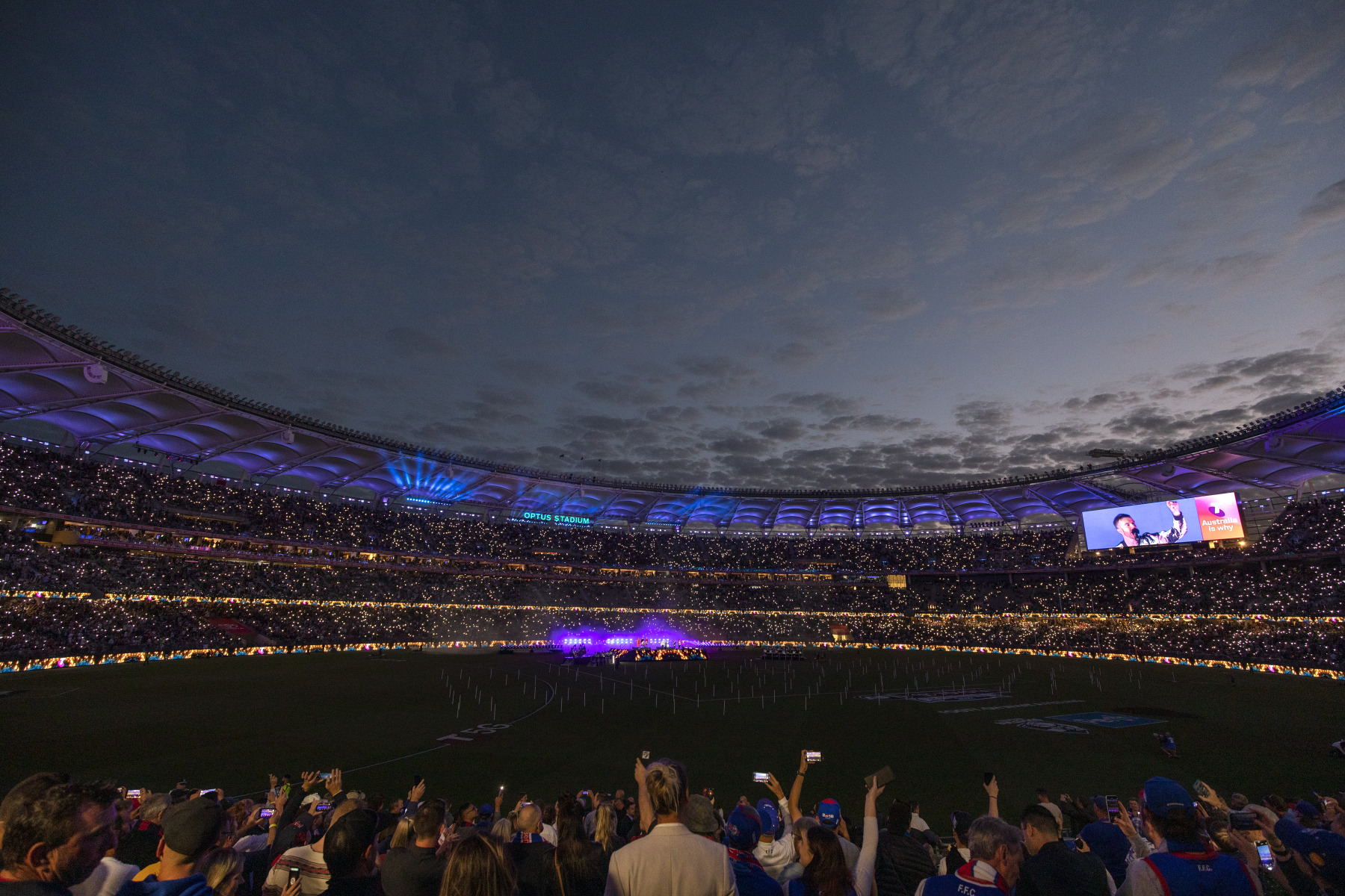Photographs of Birds of Tokyo and the West Australian Symphony Orchestra performing at half-time during the 2021 AFL Grand Final. The game was held at Optus Stadium in Perth for the first time due to COVID-19 lockdowns restricting public events in Victoria and NSW. Photographed 25 September 2021.