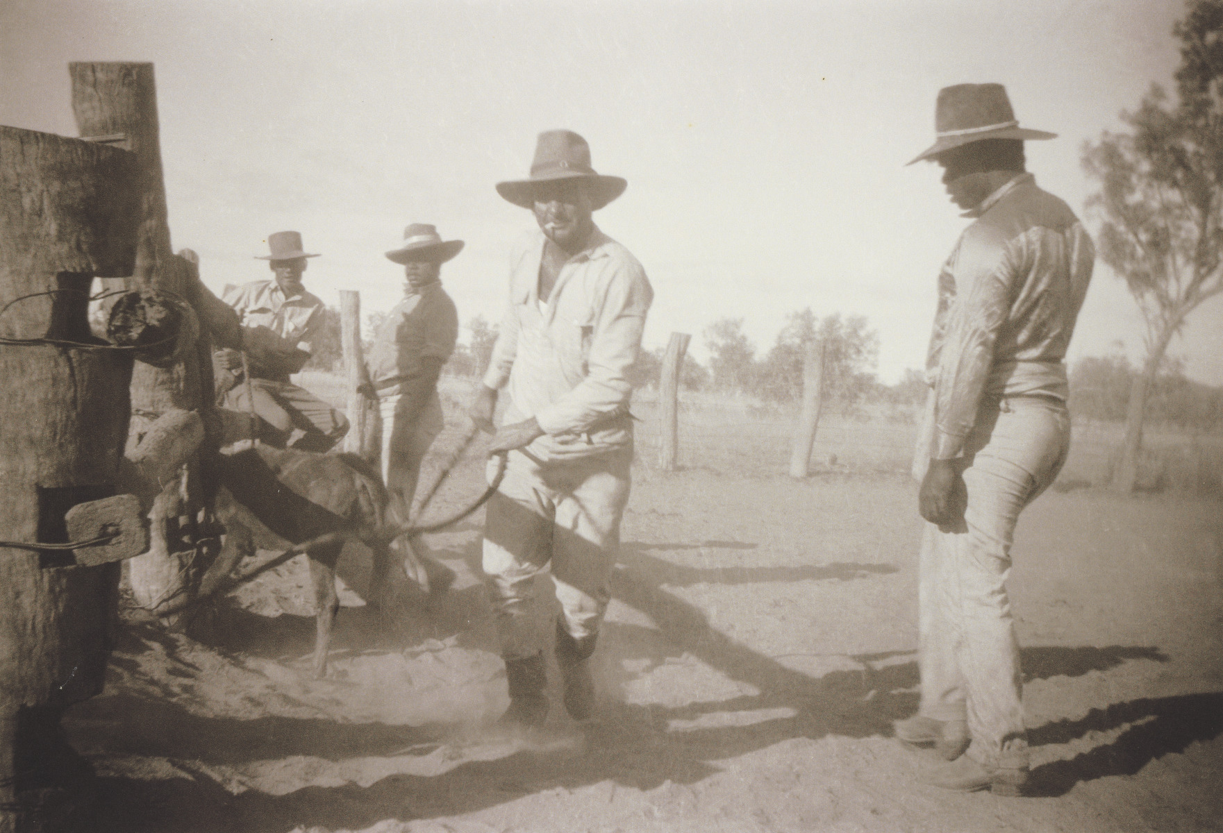BA2947/775: Sam Lovell, Billy, Jack Dale, and Jack Bear branding cattle, possibly in Womberall Yard, Napier Downs?, Western Australia, 1957-1958.