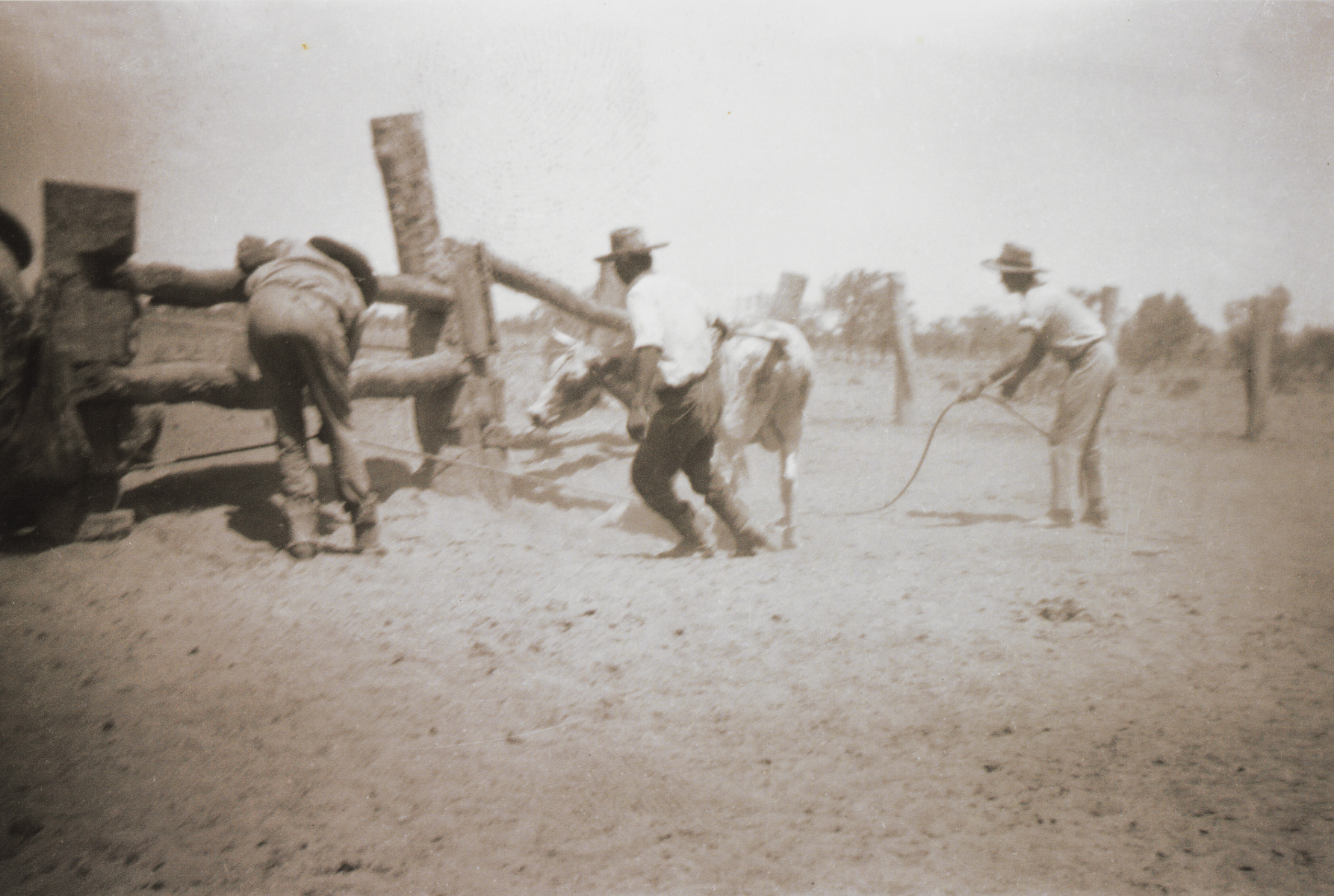 BA2947/765: Billy, Jimmy Andrew, Dick Spall branding cattle, Napier Downs, Western Australia, 1957.