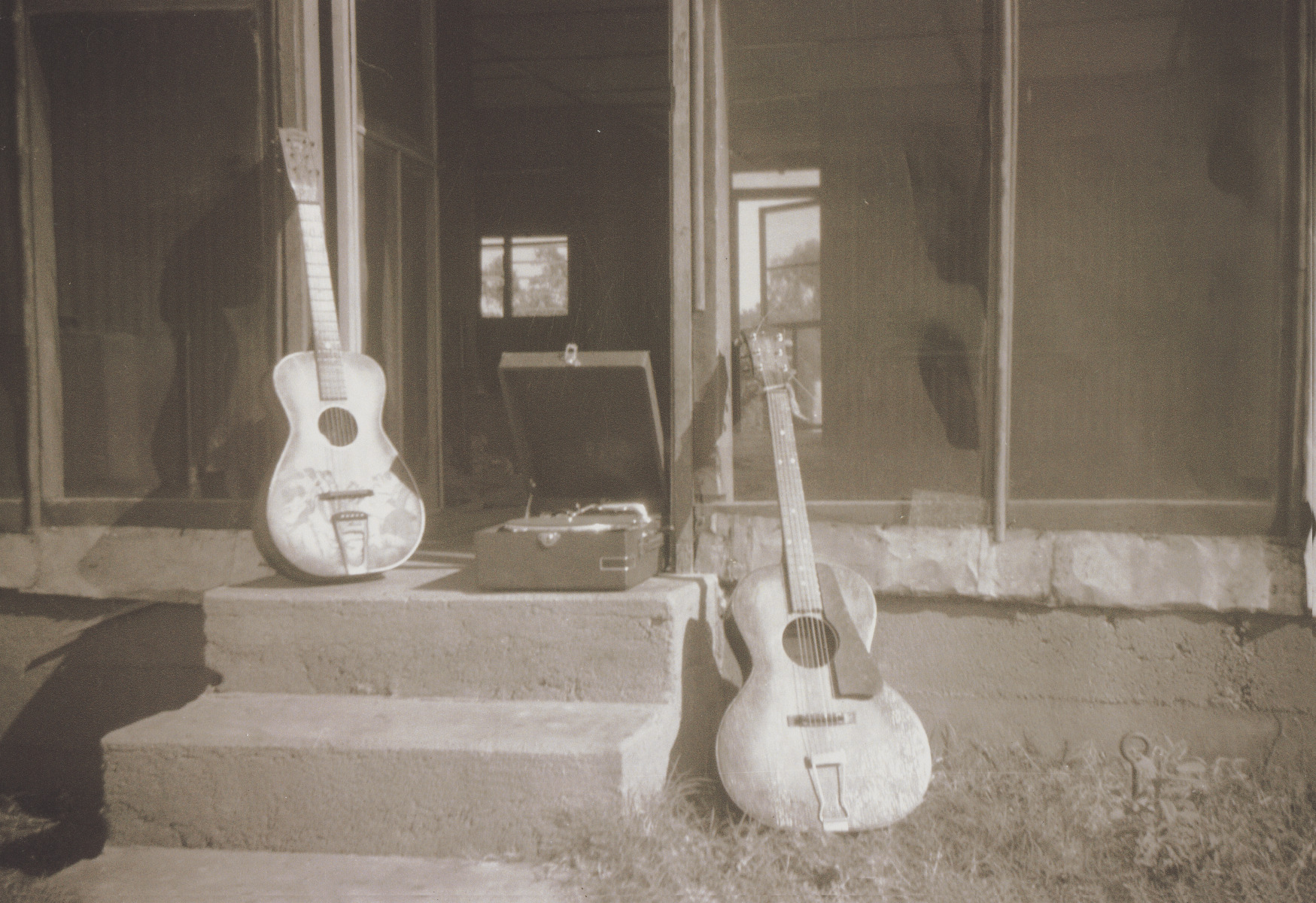 BA2947/768: Two guitars and a record player on a set of steps, Napier Downs, Western Australia, 1956 .