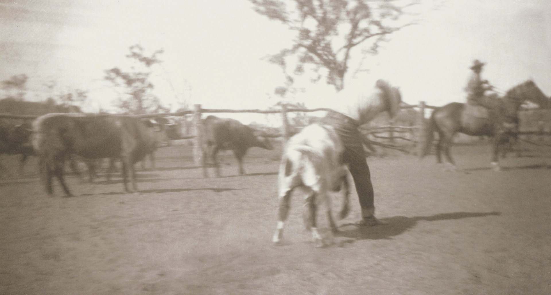 BA2947/769: Jimmy Andrew and Freddy branding or riding cattle, Napier Downs, Western Australia, 1956.