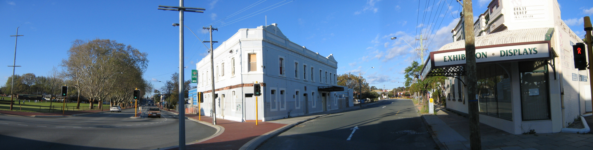 Title devised by cataloguer. Caption supplied by photographer: Panorama of Birdwood Square, Brisbane Hotel (292 Beaufort St, just after removal of its verandahs), and shops at 290 Beaufort St. 5:09 pm 26/09/2004.