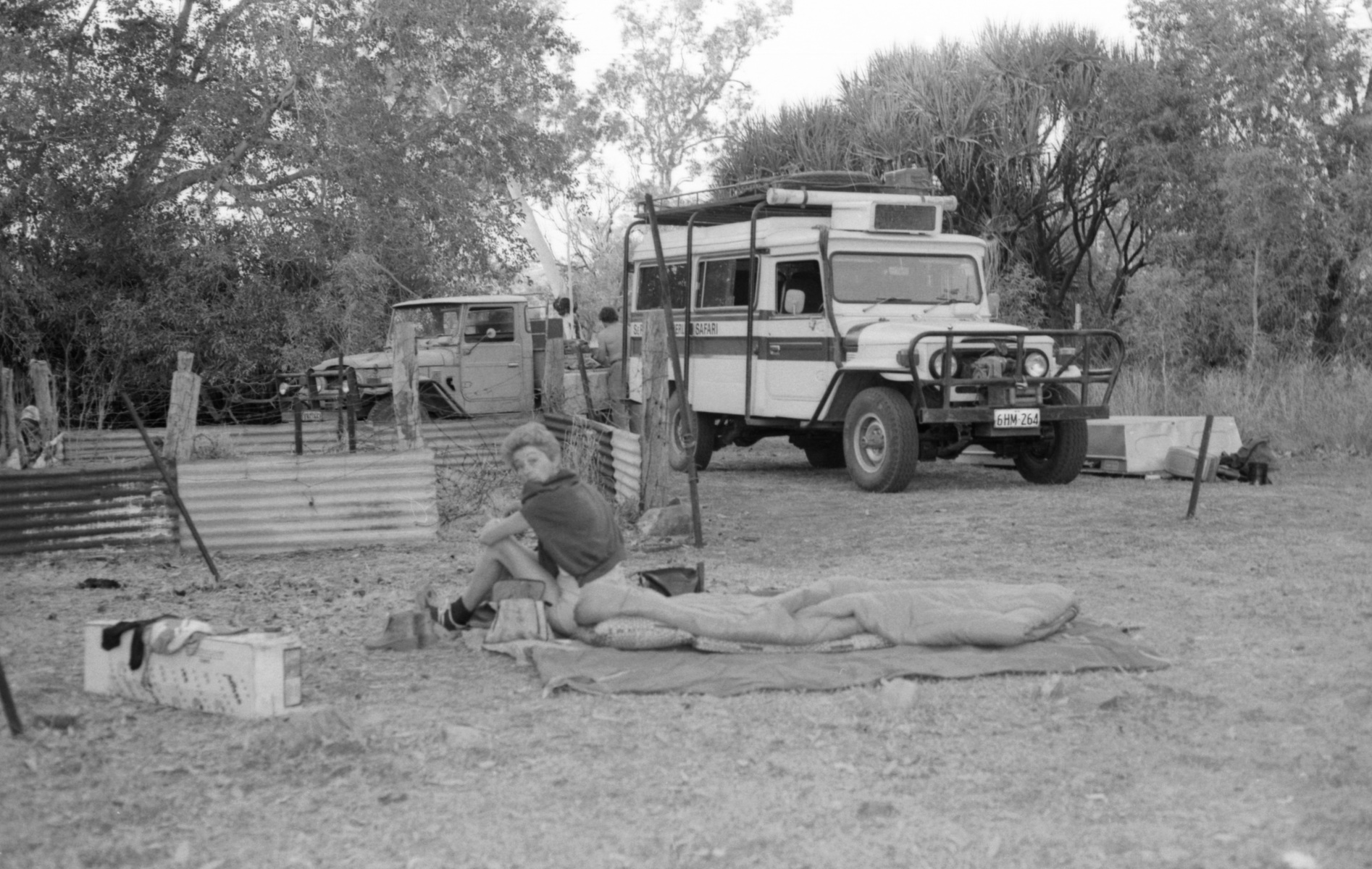 BA3566/10 : Shirley with sleeping bag and Toyota 4WD tour bus in the background at the campsite