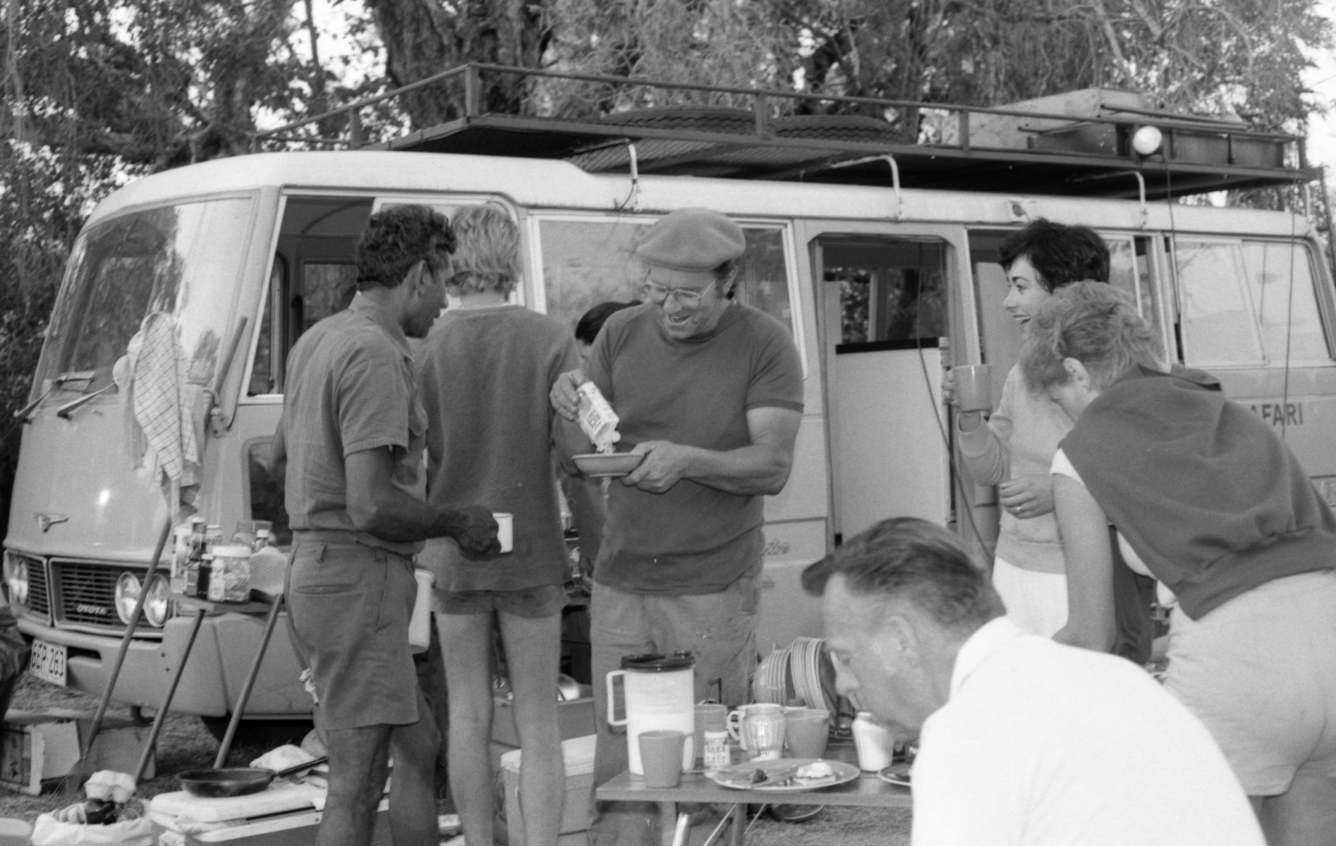 BA3566/7 : Members of the Safari group getting breakfast with the Toyota kitchen bus in the background