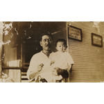 ACC 10824AD/75: Unidentified man holding a baby, possibly standing outside a store, Broome.