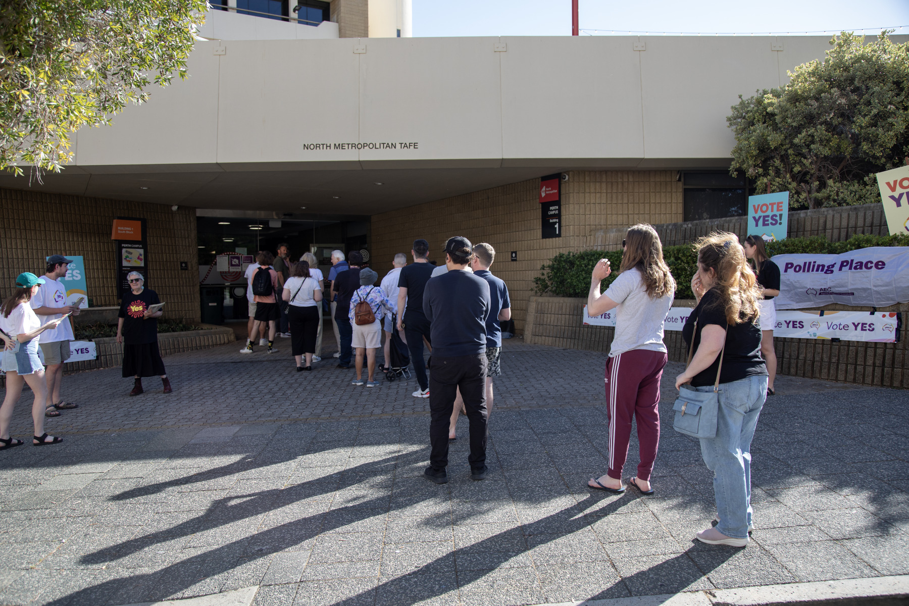 Campaigners for the Yes and No votes offer their opinions outside polling stations. A queue forms on polling day. At the Yes23 campaign party at the Rechabite Club, William Street, Perth a subdued mood prevails and news of the No result in reported on television.