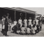 BA3039/1/148: Captain and Brown Owl with Commissioners Mrs Carlton and Miss Abbott, Brownies, Moore River Native Settlement, Western Australia, approximately 1939.